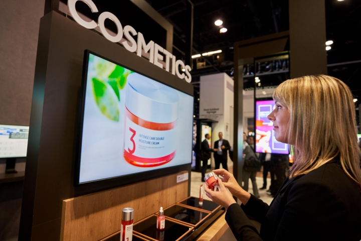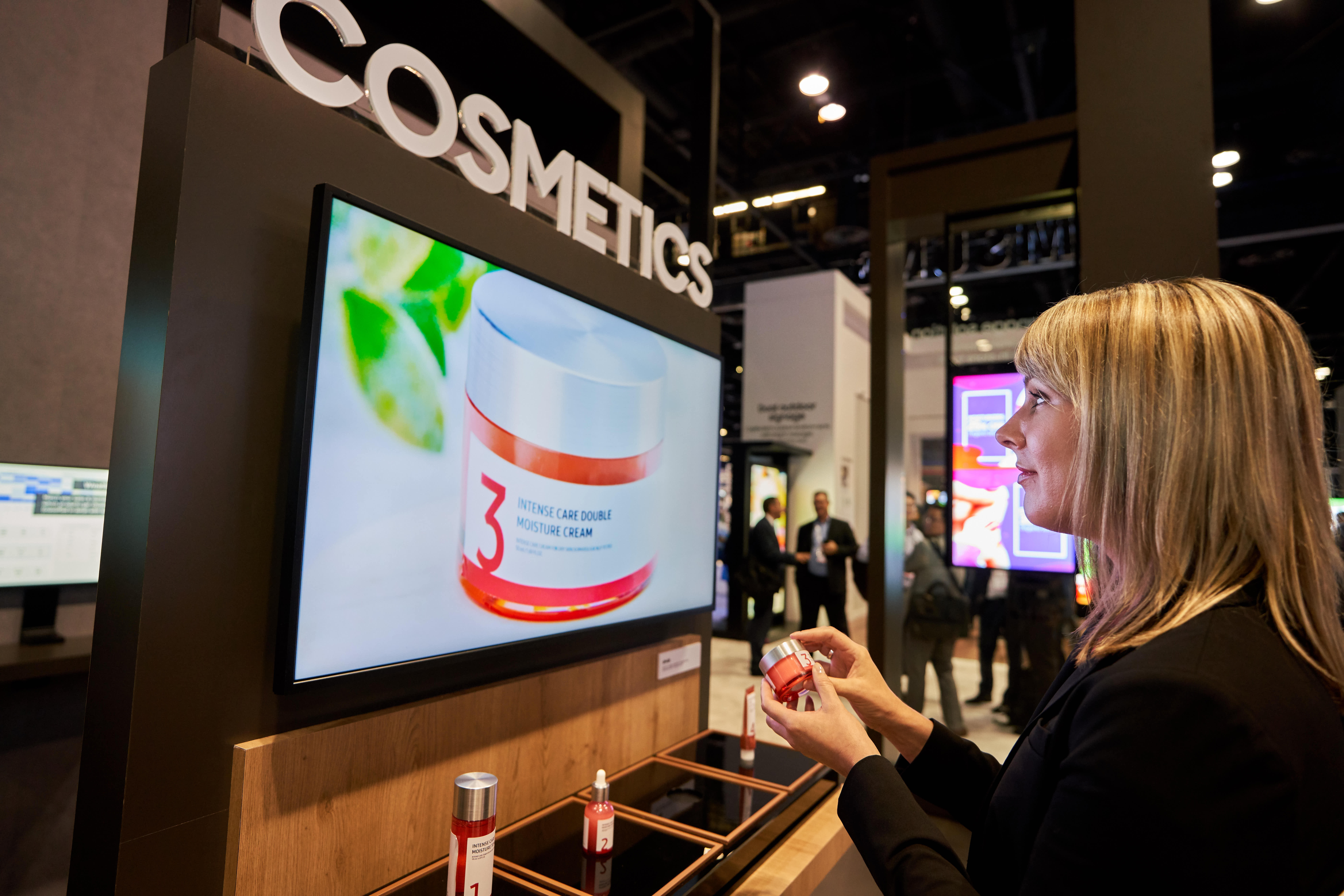 ▲ 현지시간 12일 미국 올랜도에서 열리는 세계 최대 규모의 전문 AV(AudioVisual) 전시회 ‘인포콤 2019 (Infocomm 2019)’에서 관람객이 삼성전자 매직인포7 솔루션의 인공지능 광고 기능을 체험하고 있다. 특정 화장품을 들면 제품 바닥의 센서를 인식해 해당 제품의 광고를 보여준다.