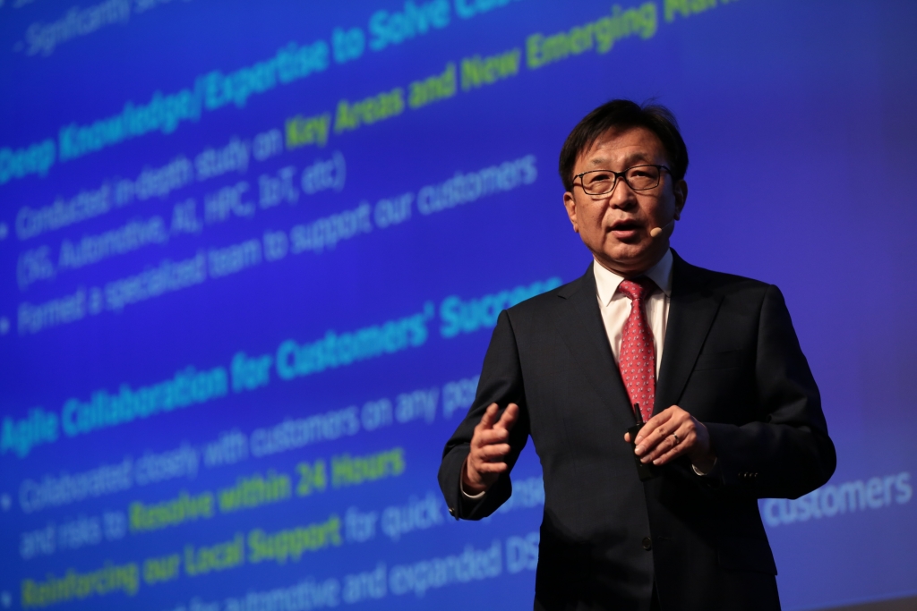 ▲ 삼성전자 파운드리사업부 정은승 사장이 3일 서울 그랜드 인터컨티넨탈 파르나스 호텔에서 열린 ‘삼성파운드리 포럼 2019 코리아’ 행사에서 기조 연설을 하고 있다.