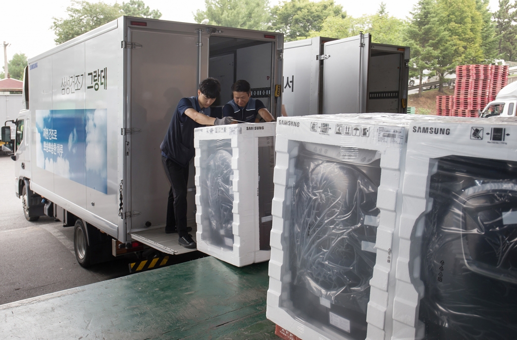 ▲ 삼성전자 제품 배송·설치 담당자들이 17일 경기도 고양시 일산서구에 위치한 삼성전자 서서울물류센터에서 삼성 건조기 그랑데를 배송하기 위해 차량에 싣고 있다. 삼성 건조기 그랑데는 높은 습도로 인해 빨래가 잘 마르지 않는 장마철 필수 가전으로 인기를 얻고 있다.
