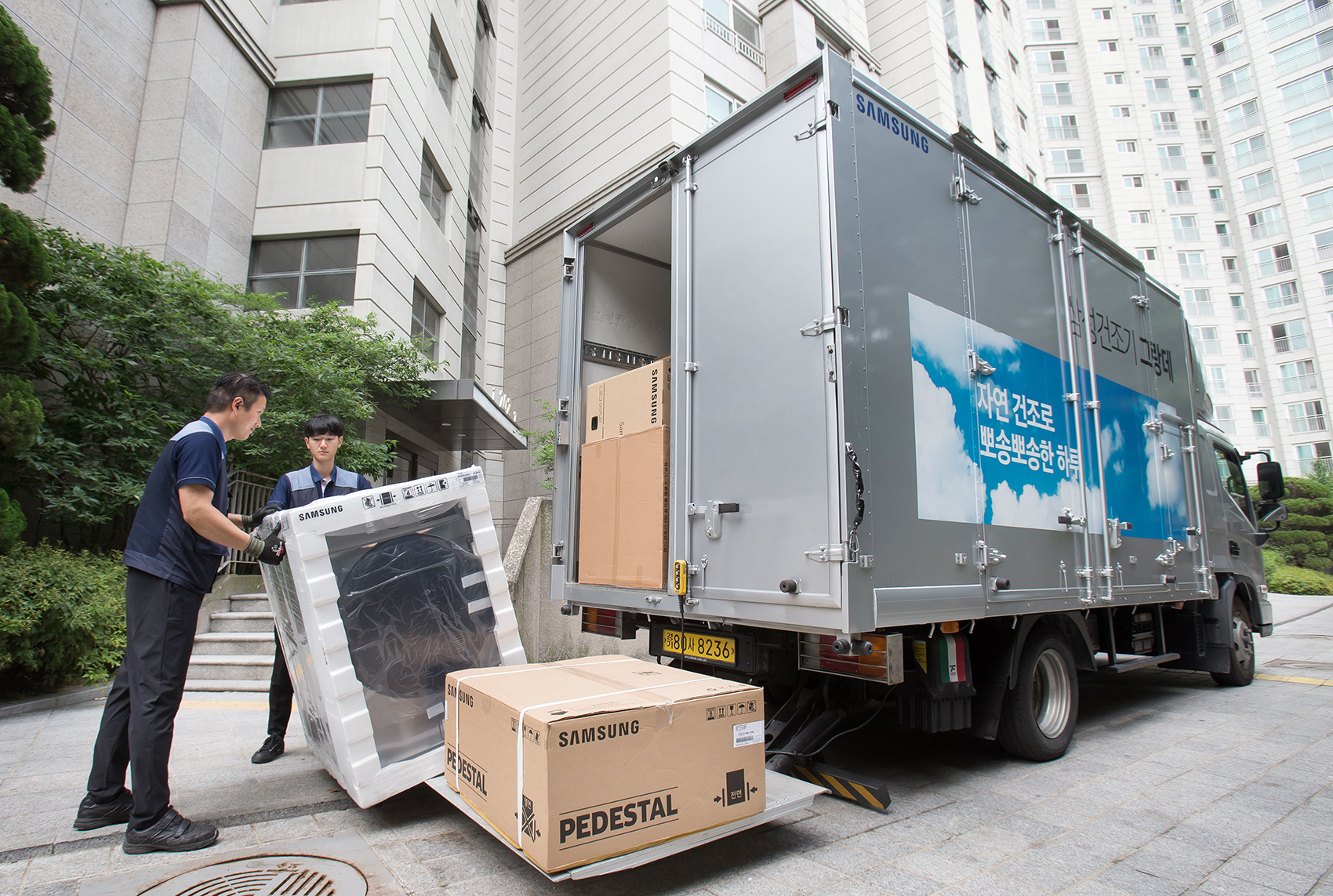 ▲ 삼성전자 제품 배송·설치 담당자들이 17일 경기도 고양시 덕양구에 위치한 아파트 단지에서 삼성 건조기 그랑데를 배송하기 위해 차량에서 내리고 있다. 삼성 건조기 그랑데는 높은 습도로 인해 빨래가 잘 마르지 않는 장마철 필수 가전으로 인기를 얻고 있다.
