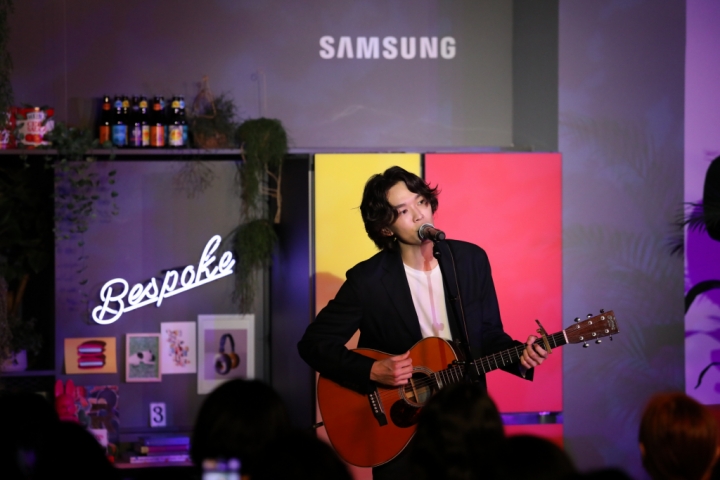 ▲ 가수 케빈오가 지난 19일 삼성디지털플라자 강남본점 5층에 위치한 삼성 라이프스타일 생활가전 쇼룸 ‘#프로젝트프리즘(ProjectPRISM)’에서 ‘프리즘 콘서트’를 열고 노래하고 있다.