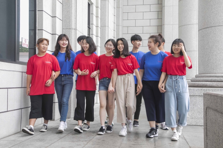 ▲ 7월 26일 용인에 위치한 경희대학교 국제캠퍼스에서 ‘2019 삼성드림클래스 여름캠프’에 참여하는 중학생들과 대학생 멘토들이 함께 교정을 걸으며 대화를 나누고 있다.