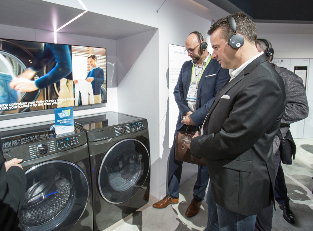▲ 지난 1월 미국 라스베이거스에서 열린 세계최대 전자 전시회 CES2019에서 관람객들이 삼성전자 건조기와 세탁기를 살펴보고 있다.