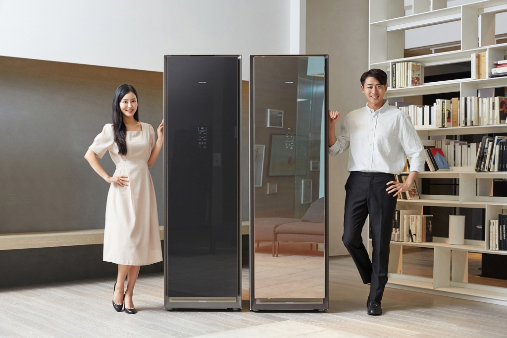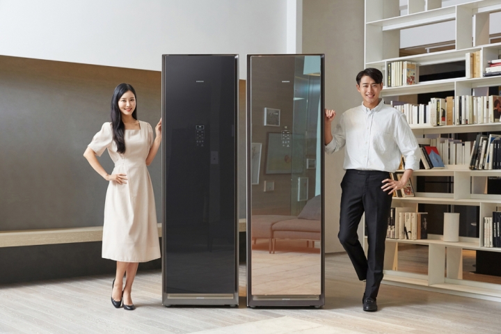 ▲ 삼성전자가 바람과 필터의 강력한 의류 청정 기술에 용량과 편의성까지 업그레이드한 ‘에어드레서’ 대용량 신제품을 출시한다. 사진은 삼성전자 모델이 ‘에어드레서’ 대용량 신규 라인업을 소개하고 있다.