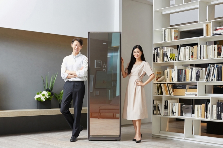 ▲ 삼성전자가 바람과 필터의 강력한 의류 청정 기술에 용량과 편의성까지 업그레이드한 ‘에어드레서’ 대용량 신제품을 출시한다. 사진은 삼성전자 모델이 ‘에어드레서’ 대용량 신규 라인업을 소개하고 있다.
