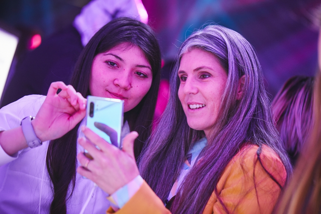 ▲ 지난 20일(현지시간) 칠레 산티아고의 ‘종합 예술 공연장(NAVE, Centro de Creación y Residencia)’에서 진행된 ‘갤럭시 노트10’ 출시 행사에서 참석자들이 제품을 체험하고 있다.