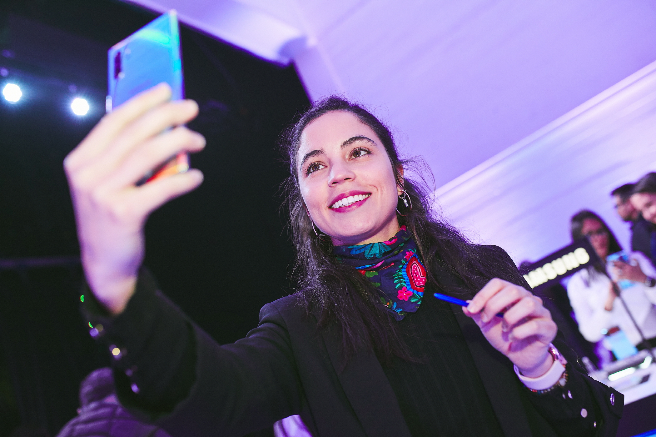 ▲ 지난 20일(현지시간) 칠레 산티아고의 ‘종합 예술 공연장(NAVE, Centro de Creación y Residencia)’에서 진행된 ‘갤럭시 노트10’ 출시 행사에서 참석자들이 제품을 체험하고 있다.