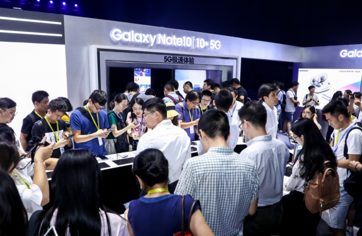 ▲ 지난 21일(현지 시간)에 중국 베이징에서 진행된 ‘갤럭시 노트10’ 출시 행사에 참석한 미디어들이 제품을 체험하고 있다.