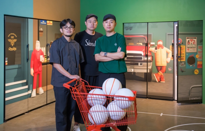 ▲ 22일 서울 인사동 인사아트센터에서 열린 아트슈퍼마켓 사전행사에 참석해 삼성 비스포크 냉장고 앞에서 기념촬영을 하고 있는 디자인 스튜디오 슈퍼픽션 작가 김형일, 송온민, 이창은.