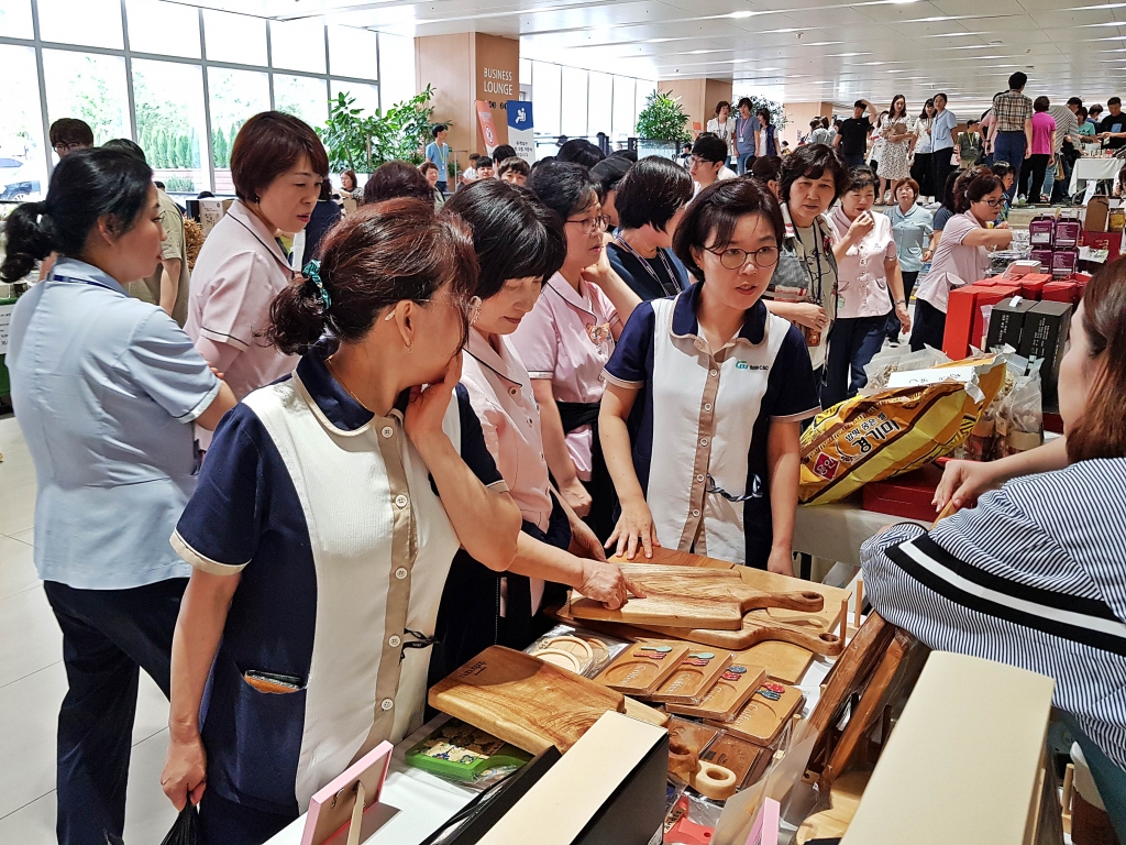 ▲ 2일 삼성전자 화성사업장에서 열린 추석맞이 직거래 장터에서 임직원들이 삼성전자 자매마을에서 생산된 상품들을 둘러보고 있다.