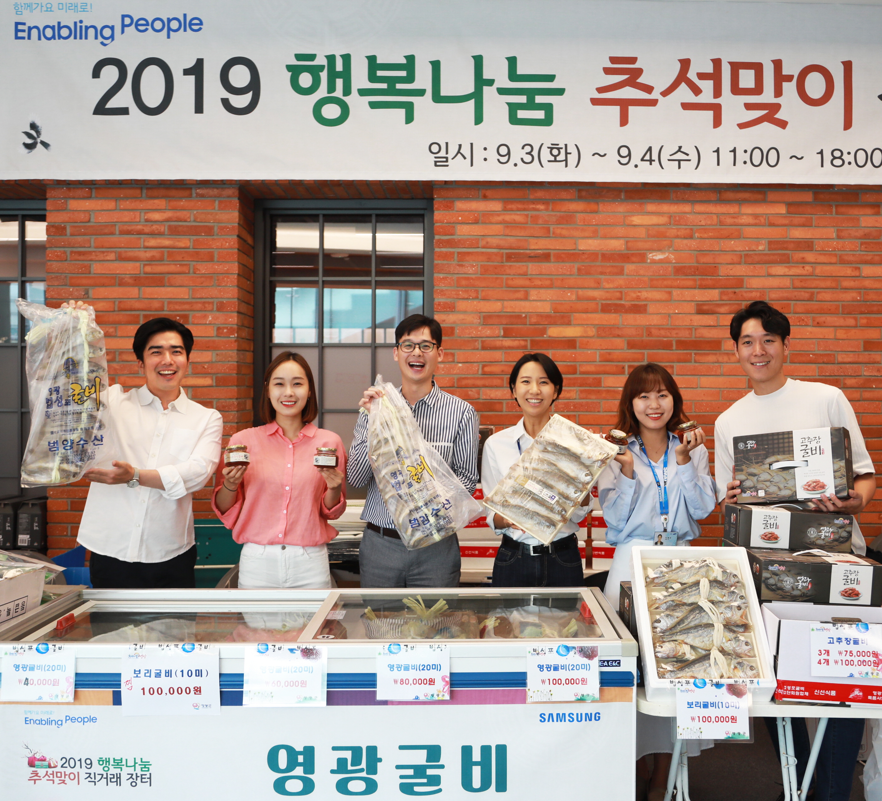 ▲ 3일 삼성전자 수원사업장에서 열린 추석맞이 직거래 장터에서 임직원들이 삼성전자 자매마을과 스마트공장 지원업체에서 생산된 상품들을 선보이고 있다.
