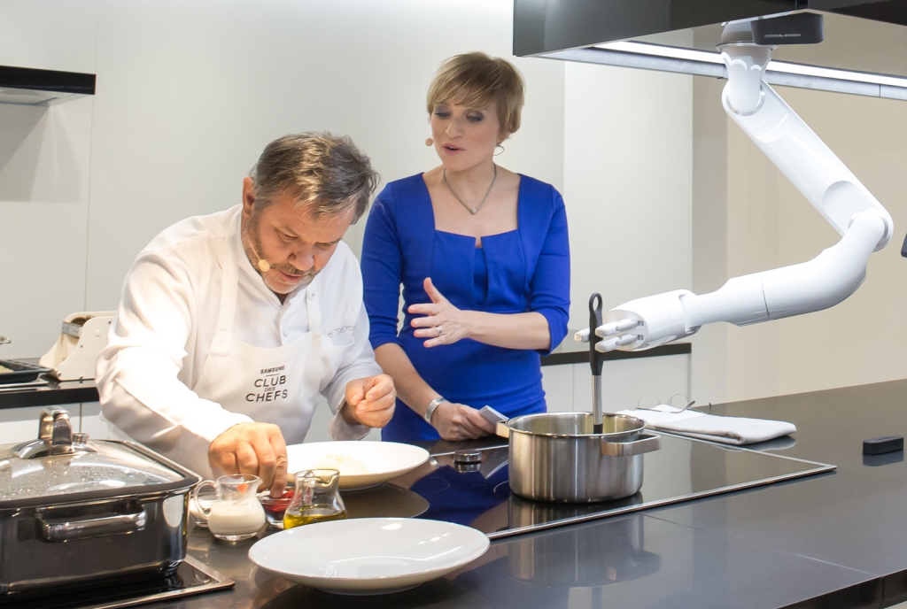 ▲ 삼성전자가 독일 베를린에서 6일부터 11일까지 열리는 유럽 최대 가전 전시회 ‘IFA 2019’에 참가해 삼성 클럽 더 셰프와 삼성봇 셰프가 협업해 요리하는 시연을 선보이고 있다. ‘삼성봇 셰프’는 로봇 팔에 다양한 도구를 바꿔 장착함으로써 식재료를 자르고 섞거나 양념을 넣는 등의 요리 보조 기능을 지원하며, 레시피를 다운로드 받아 필요한 작업을 수행할 수 있다.