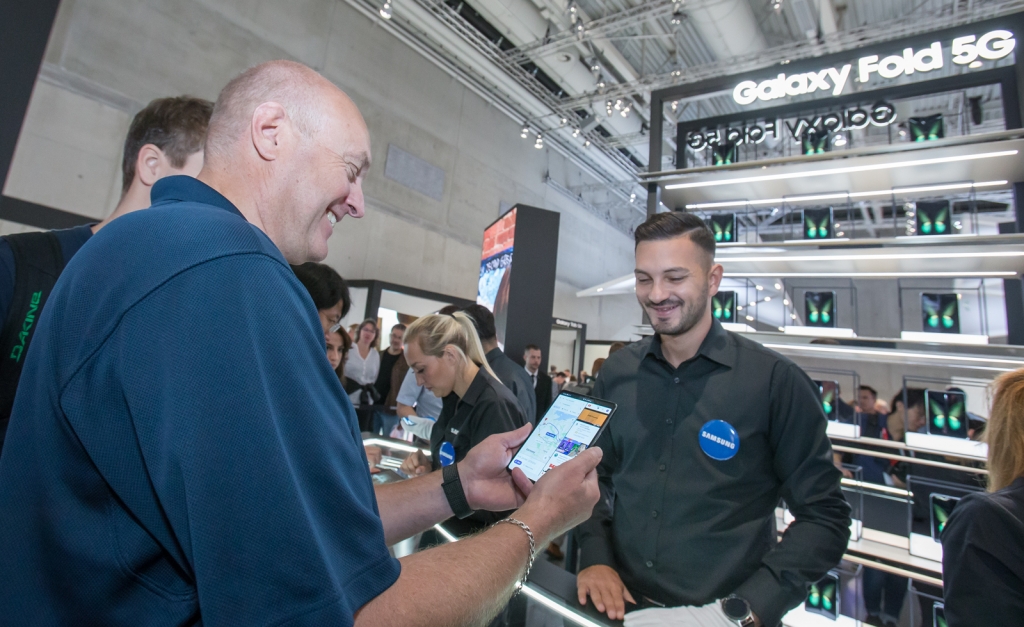 ▲ 7일(현지 시간) 독일 베를린에서 열리는 유럽 최대 가전 전시회 ‘IFA 2019’에서 삼성전자 전시장을 방문한 관람객들이 ‘갤럭시 폴드 5G’를 체험하고 있다.
