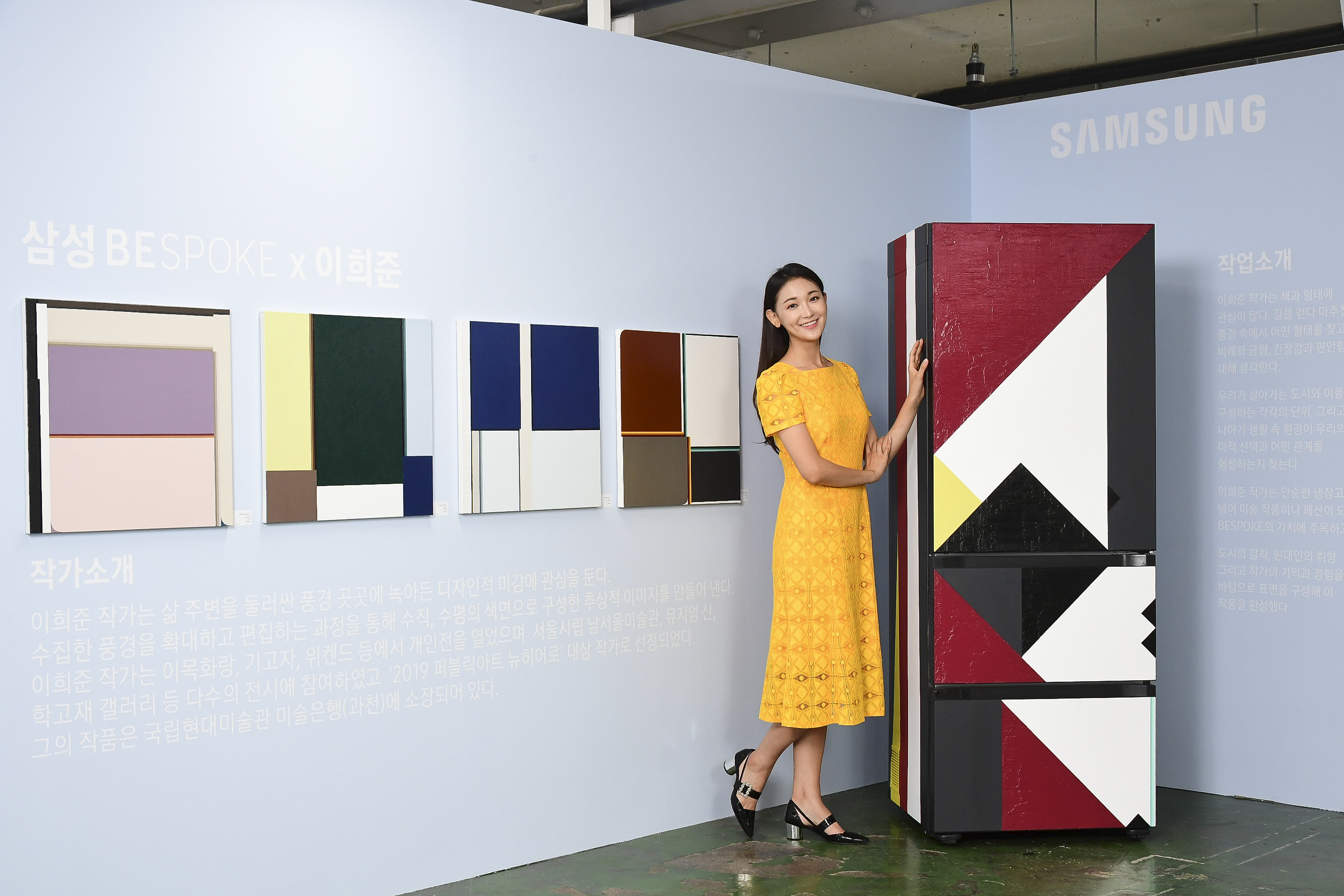 ▲ 삼성전자 모델이 20일부터 29일까지 서울 성수동 에스팩토리에서 열리는 ‘2019 유니온 아트페어’에서 삼성전자와 이희준 작가가 협업한 ‘이 세상에 단 하나뿐인 냉장고’를 배경으로 포즈를 취하고 있다. 이희준 작가는 도시의 풍경을 추상적 회화로 표현한 작품들을 주로 선보여 왔으며, 비스포크 냉장고에도 이 같은 작품세계를 접목시켰다.