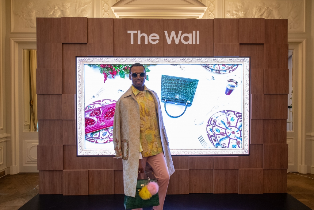 ▲ 삼성전자와 명품 패션브랜드 콜롬보가 프랑스 파리에서 진행되고 있는 패션위크에서 23일(현지시간) 쇼케이스를 진행했다. 프랑스의 유명 스타일리스트가 삼성 ‘더 월 럭셔리(The Wall Luxury)’ 앞에서 포즈를 취하고 있다.