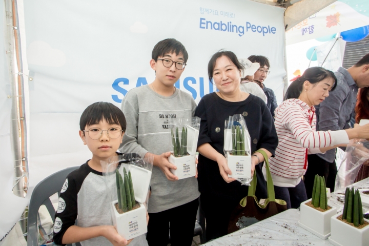 ▲ 6일 부산에서 열린 ‘세상모든가족함께 바다 나들이’ 행사에 참여한 시민들이 삼성전자 청소년자립지원 사업 소개 부스에서 화분만들기 체험을 즐기고 있다.