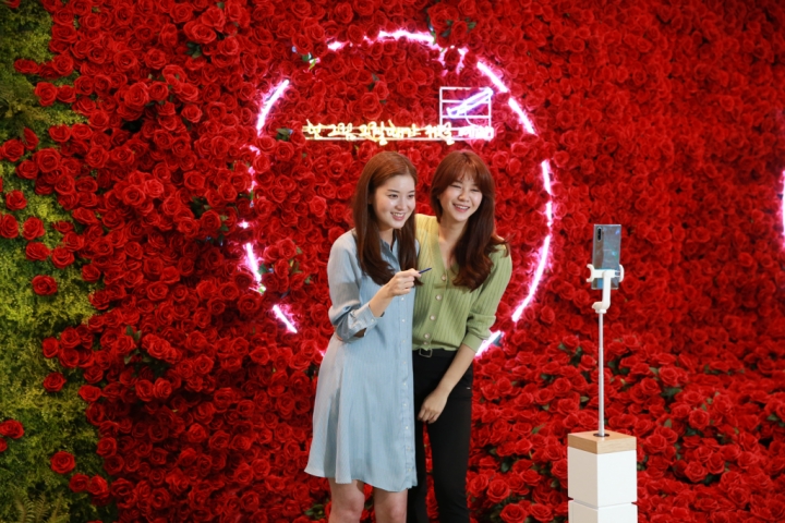 ▲ 한국전자전(KES) 삼성전자관 모바일존에서 모델들이 ‘갤럭시 노트10 5G’의 ‘S펜’을 활용해 셀피를 촬영하고 있다.
