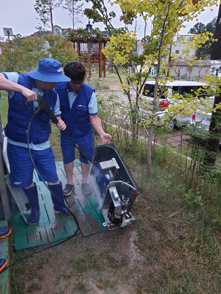 ▲ 경북 영덕군 강구면을 방문한 삼성전자서비스 엔지니어들이 전문장비를 활용해 토사가 유입된 에어컨 실외기를 세척하고 있다.