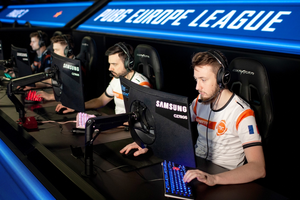 ▲ 2019년 10월 6일부터 20일까지 독일 베를린에서 열리는 ‘PUBG2019 배틀그라운드 토너먼트 대회’에서 240Hz 주사율을 지원하는 삼성전자 커브드 게이밍 모니터 ‘CRG5’가 공식 모니터로 선정되었다. 선수들이 CRG5 모니터를 활용해 게임을 하고 있다.