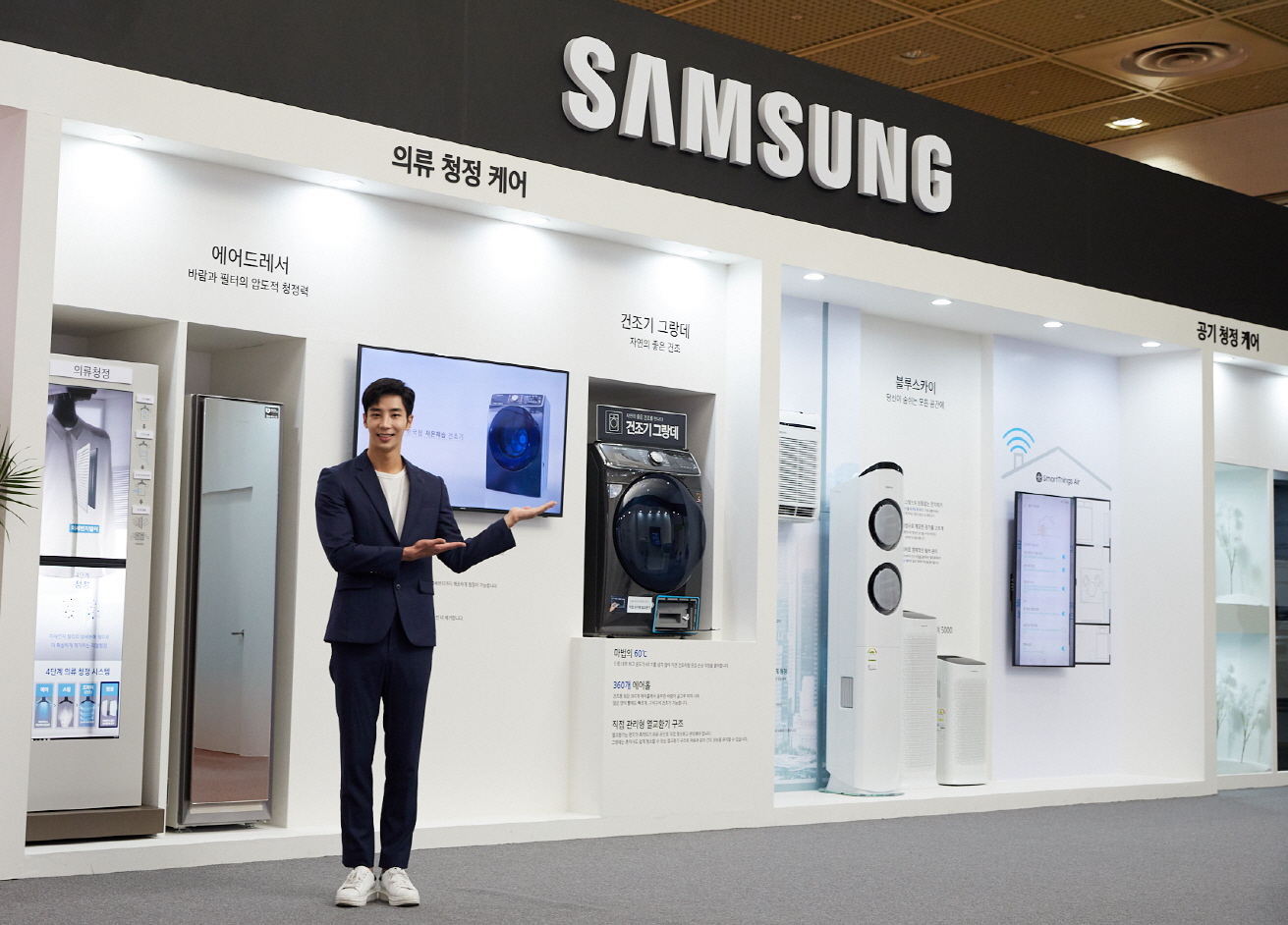 ▲ 삼성전자가 25일부터 27일까지 서울 코엑스(COEX)에서 열리는 ‘에어페어2019(Air Fair 2019)’에 참가해 미세먼지 해결가전을 선보였다. 삼성전자 모델이 삼성전자의 의류청정 기술을 소개하고 있다.