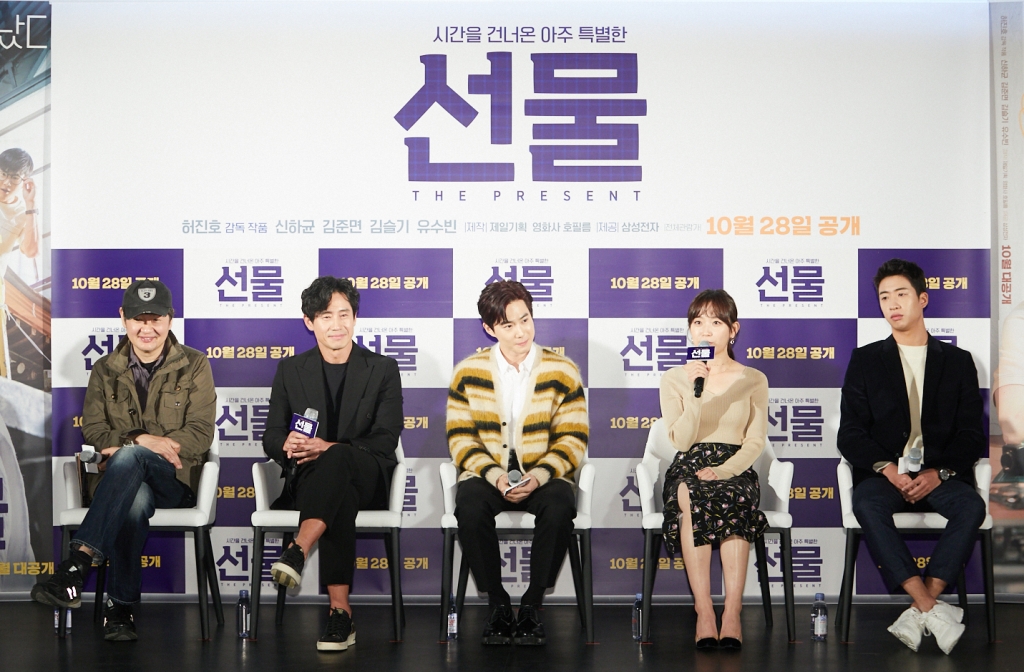 ▲ 28일 롯데시네마 건대입구에서 열린 삼성전자 네번째 단편영화 ‘선물’ 시사회에 감독과 배우들이 참석해 인사를 하고 있다. 허진호 감독, 배우 신하균, 김준면, 김슬기, 유수빈(왼쪽부터)