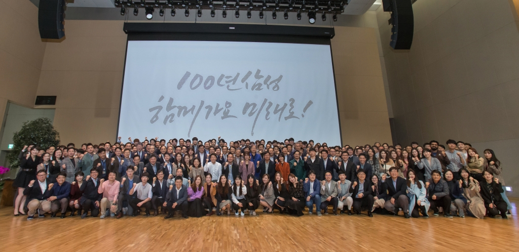 ▲ 삼성전자 창립 50주년을 맞아 1일 수원 ‘삼성 디지털 시티’에서 경영진과 임직원들이 초일류 100년 기업의 역사를 쓰자고 다짐하며, 화이팅을 힘차게 외치고 있다.