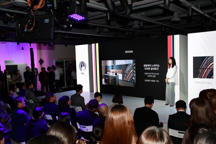 ▲ 삼성 비스포크 냉장고 디자인 공모전 온라인 공개투표와 전문가 심사로 선정된 파이널리스트 10명이 13일 삼성디지털프라자 강남본점 5층에 위치한 라이프스타일 쇼룸 #ProjectPRISM에서 2백여명의 행사 참가자와 심사위원단 앞에서 작품을 설명하고 있다.