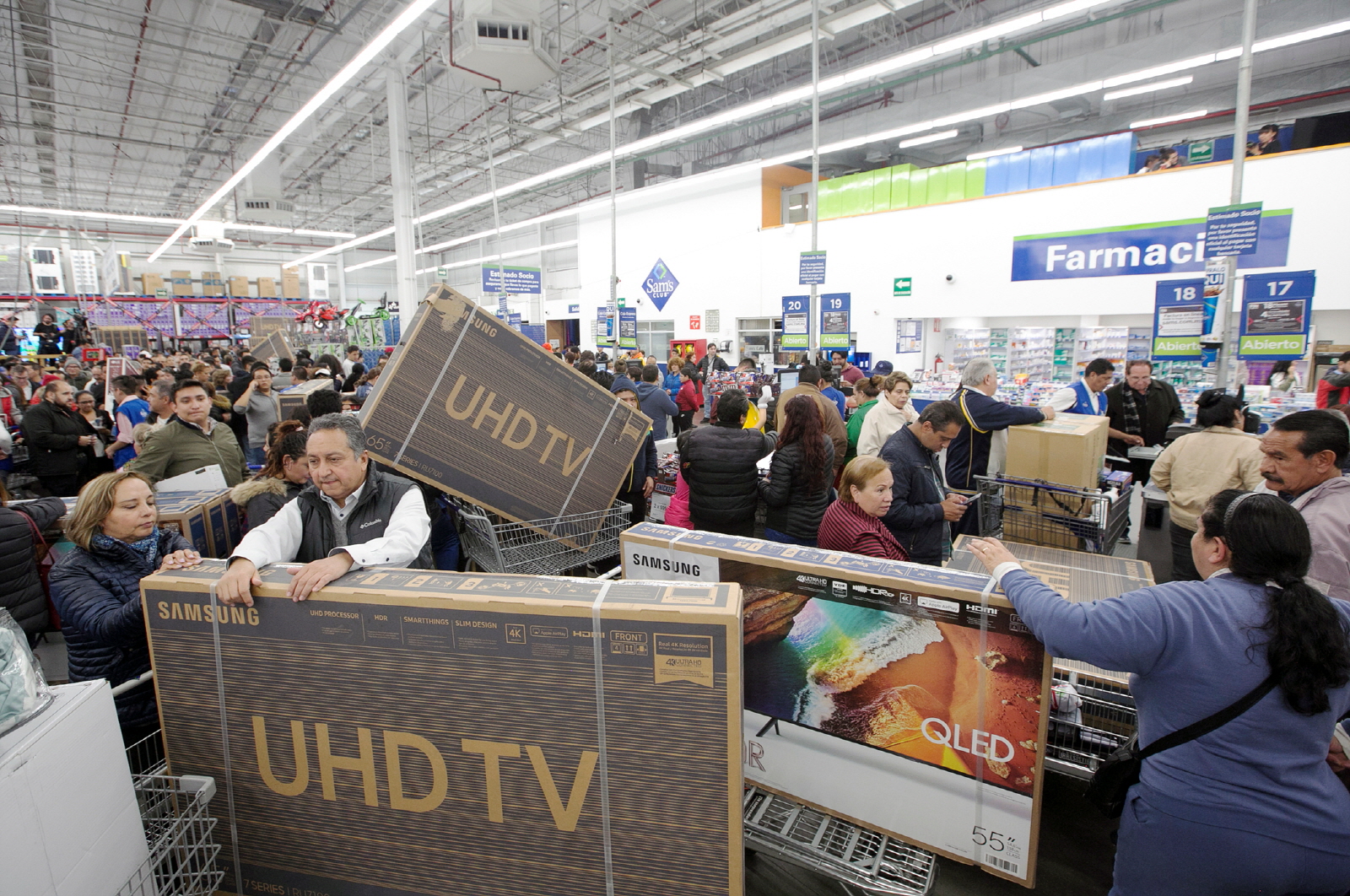 ▲ 멕시코의 블랙 프라이데이라고 불리는 ‘부엔핀(El Buen Fin)’ 행사를 앞둔 14일 자정(현지시간), 멕시코 시티에 위치한 창고형 매장 ‘샘스클럽(Sam’s Club)’에 삼성 TV를 구매하려는 소비자들이 인산인해를 이루고 있다.
