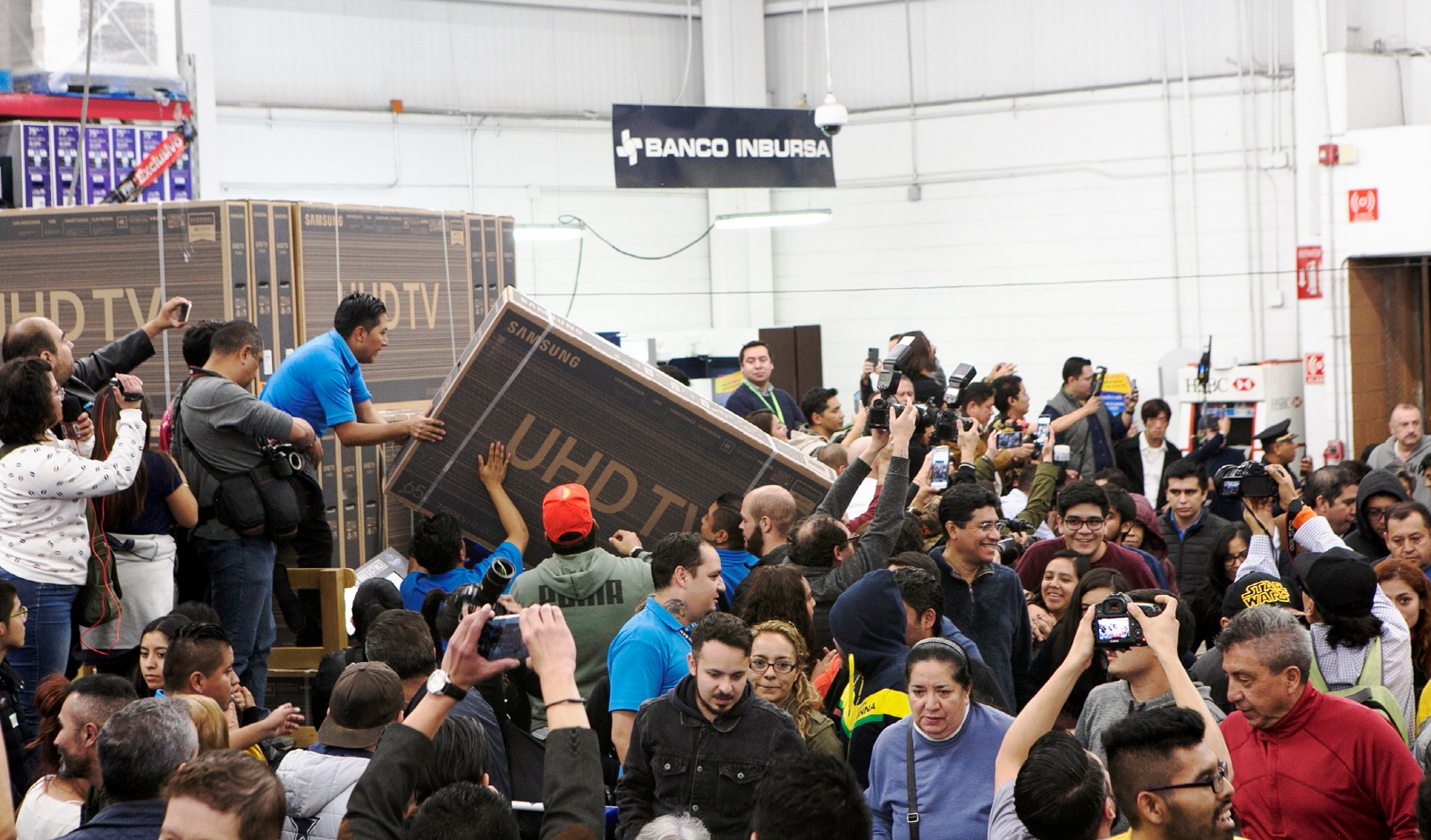 ▲ 멕시코의 블랙 프라이데이라고 불리는 ‘부엔핀(El Buen Fin)’ 행사를 앞둔 14일 자정(현지시간), 멕시코 시티에 위치한 창고형 매장 ‘샘스클럽(Sam’s Club)’에 삼성 TV를 구매하려는 소비자들이 인산인해를 이루고 있다.