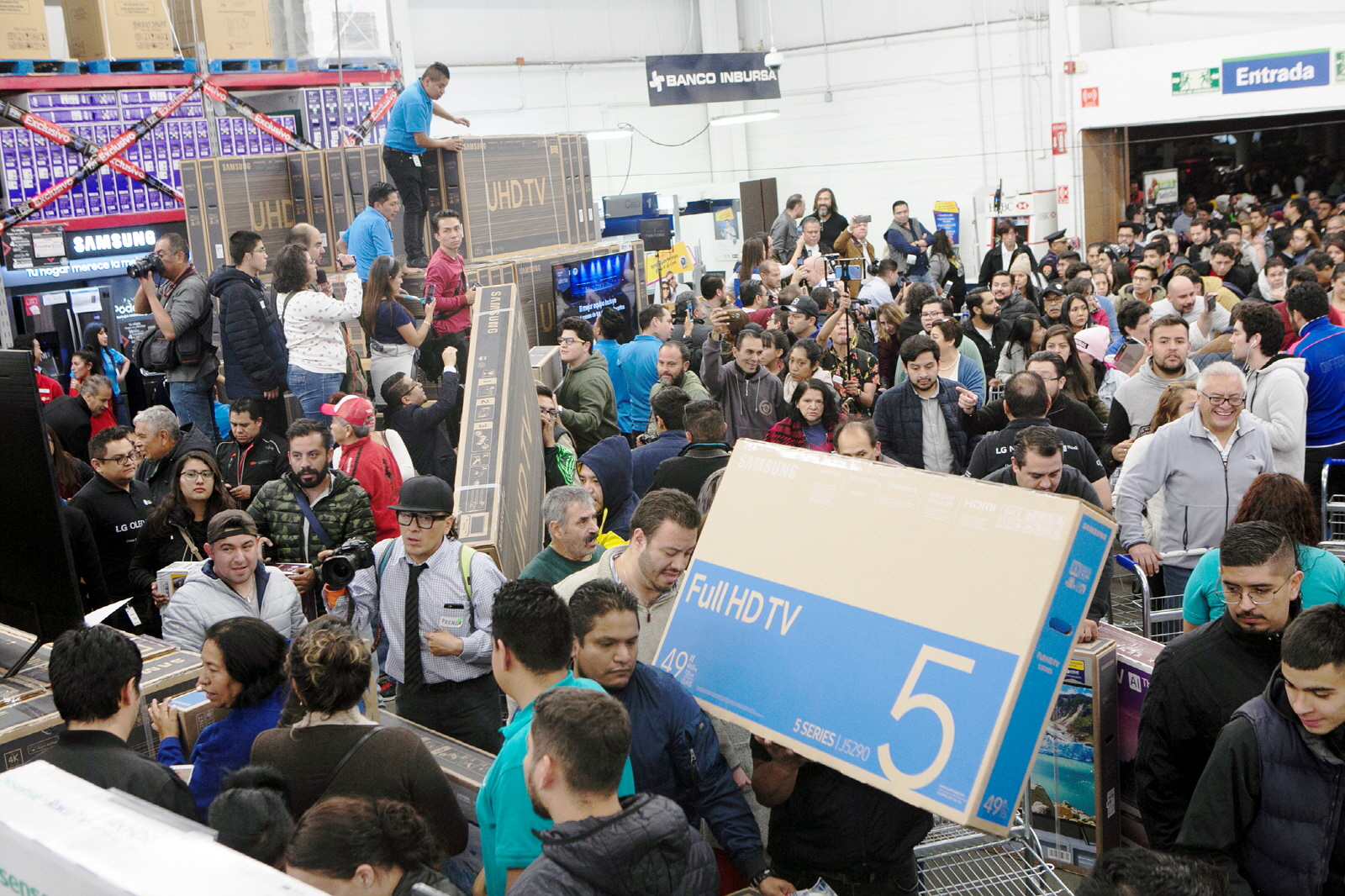 ▲ 멕시코의 블랙 프라이데이라고 불리는 ‘부엔핀(El Buen Fin)’ 행사를 앞둔 14일 자정(현지시간), 멕시코 시티에 위치한 창고형 매장 ‘샘스클럽(Sam’s Club)’에 삼성 TV를 구매하려는 소비자들이 인산인해를 이루고 있다.