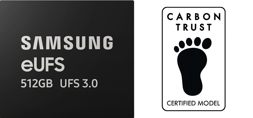 ▲ 영국 카본 트러스트로부터 친환경 인증인 ‘탄소 발자국’과 ‘물 발자국’을 획득한 ‘512GB eUFS 3.0’ 제품 이미지와 카본 트러스트 로고.