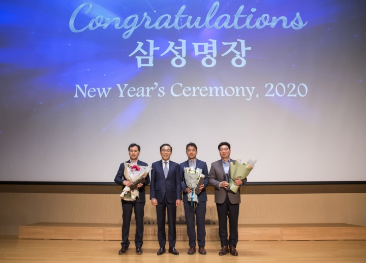 ▲ 2일 수원 ‘삼성 디지털 시티’에서 열린 삼성전자 시무식에서 김기남 대표이사 부회장과 ‘삼성명장’으로 선정된 직원들이 기념 촬영을 하고 있다. (왼쪽부터 레이아웃 부문 이승권 명장, 김기남 대표이사 부회장, 설비 부문 배종용 명장, 제조기술 부문 문영준 명장)