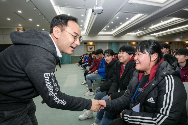 ▲ 삼성전자 노희찬 사장이 ‘2020 삼성 드림클래스 겨울캠프’에 참가한 중학생들을 격려하고 있다.