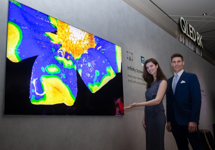 ▲ 삼성전자 모델이 삼성전자 QLED 8K 85형 신제품을 소개하고 있다.