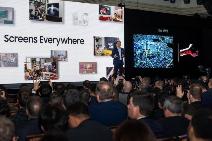 ▲ 5일(현지시간) 미국 라스베이거스에서 열린 삼성 퍼스트 룩 행사에서 삼성전자 영상디스플레이 사업부장 한종희 사장이 삼성의 ‘스크린 에브리웨어(Screens Everywhere)’ 비전을 발표하고 있다.