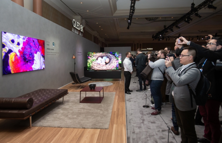 ▲ 5일(현지시간) 미국 라스베이거스에서 열린 삼성 퍼스트 룩 행사에 참가한 전 세계 기자들이 삼성전자 2020년형 QLED 8K 신제품을 살펴보고 있다.
