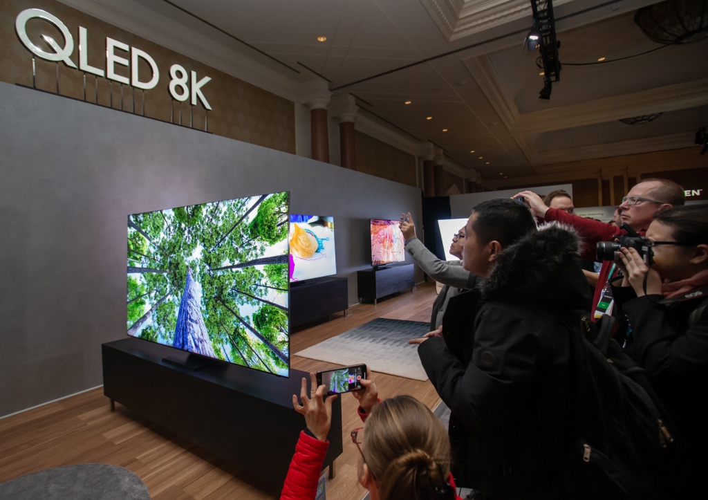 ▲ 5일(현지시간) 미국 라스베이거스에서 열린 삼성 퍼스트 룩 행사에 참가한 전 세계 기자들이 삼성전자 2020년형 QLED 8K 신제품의 15mm 초슬림 디자인 슬림의 살펴보고 있다.