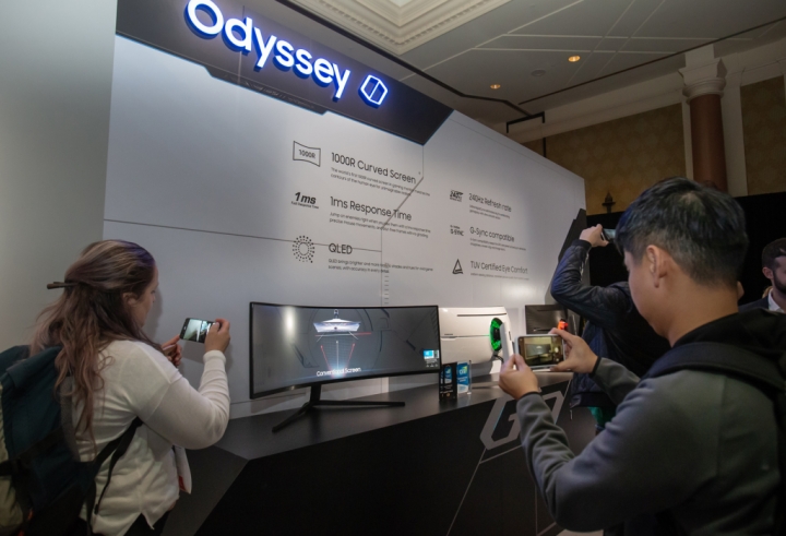 ▲ 5일(현지시간) 미국 라스베이거스에서 열린 삼성 퍼스트 룩 행사에 참가한 전 세계 기자들이 삼성전자 게이밍 모니터 신제품 ‘오디세이(Odyssey)’를 살펴보고 있다.