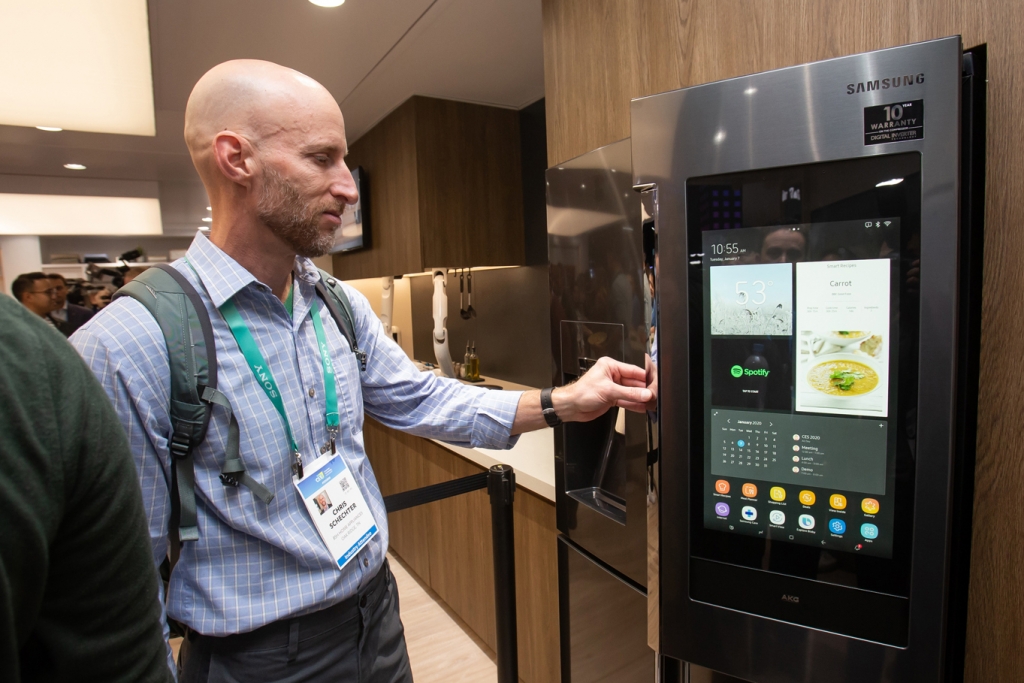 ▲ 미국 라스베이거스에서 열리는 세계 최대 전자 전시회 CES 2020 개막일인 7일(현지시간) 삼성전자 전시관에서 관람객들이 한 단계 진화한 ‘패밀리허브’를 체험하고 있다.