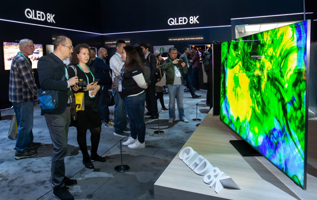 ▲ 미국 라스베이거스에서 열리는 세계 최대 전자 전시회 CES 2020 개막일인 7일(현지시간) 삼성전자 전시관에서 관람객들이 QLED 8K의 생생한 화질을 감상하고 있다.