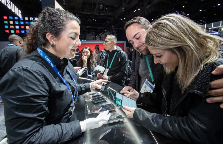 ▲ 미국 라스베이거스에서 열리는 세계 최대 전자 전시회 CES 2020 개막일인 7일(현지시간) 삼성전자 전시관에서 관람객들이 ‘갤럭시 폴드 5G’를 체험하고 있다.