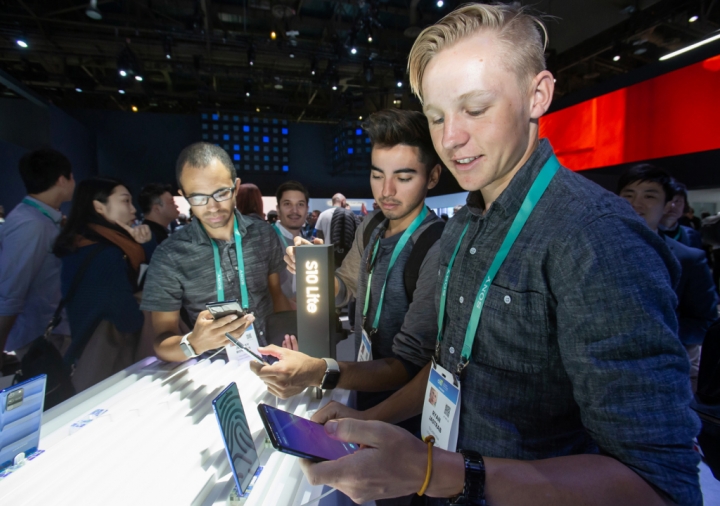 ▲ 미국 라스베이거스에서 열리는 세계 최대 전자 전시회 CES 2020 개막일인 7일(현지시간) 삼성전자 전시관에서 관람객들이 ‘갤럭시 S10 라이트’를 체험하고 있다.