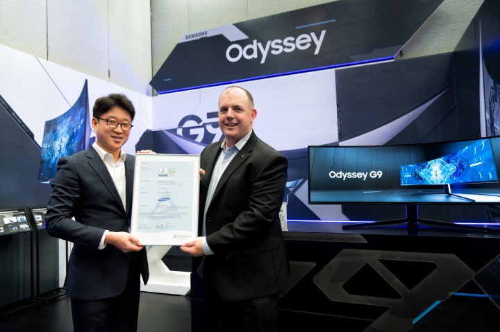 ▲ 7일(현지시간) 미국 라스베이거스에서 열리는 세계 최대 전자 전시회 CES 2020에서 세계적 규격 인증 기관인 독일 ‘TUV라인란드’가 업계 최초로 삼성전자 게이밍 모니터 ‘오디세이(Odyssey)’ G9 ∙ G7에 적용된 기술이 세계 최고 곡률 1000R 디스플레이임을 인증했다. 사진은 좌측부터 삼성전자 영상디스플레이사업부 유준영 상무, TUV라인란드 마이클 크로닌(Michael Cronin) 상무