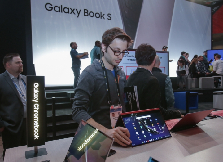 ▲ 7일(현지시간) 미국 라스베이거스에서 열리는 세계 최대 전자 전시회 CES 2020에서 삼성전자 갤럭시 체험관을 방문한 관람객들이 ‘갤럭시 크롬북(Galaxy Chromebook)’을 체험하고 있다.