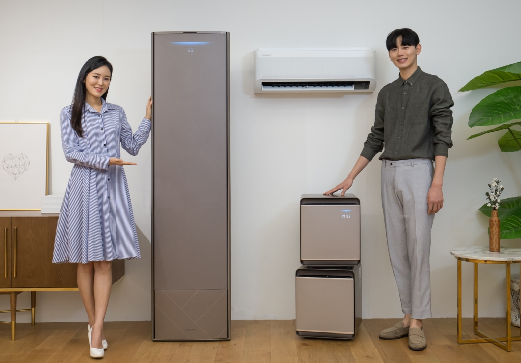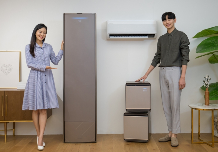 ▲ 삼성전자 모델들이 2020년형 ‘무풍에어컨’과 공기청정기 ‘무풍큐브’를 소개하고있다.