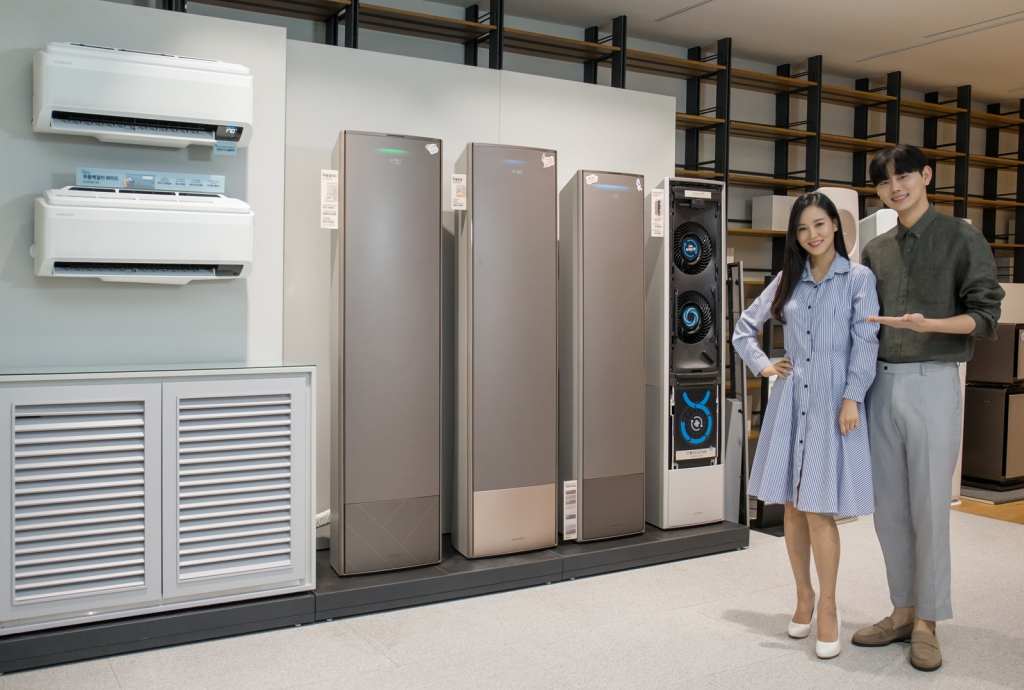 ▲ 삼성전자 모델들이 2020년형 ‘무풍에어컨’과 공기청정기 ‘무풍큐브’를 소개하고있다.