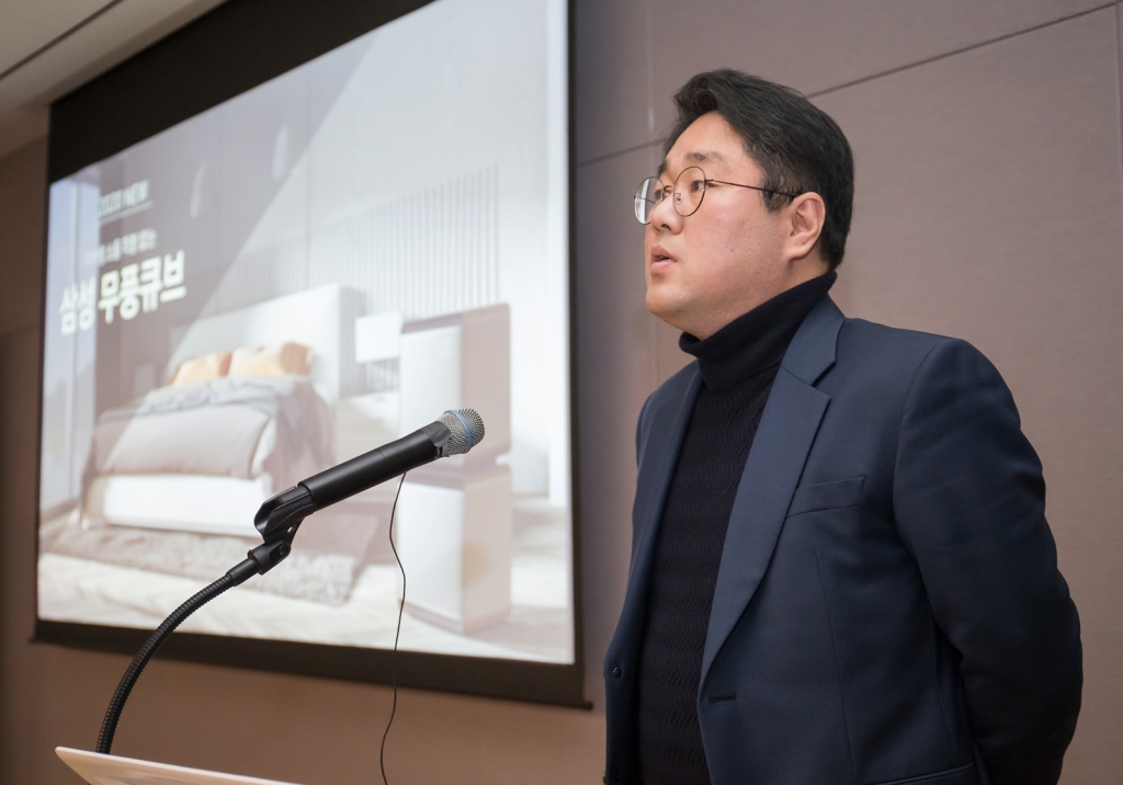 ▲ 삼성전자가 15일 서울 우면동에 위치한 ‘삼성전자 서울 R&D캠퍼스’에서 기자간담회를 열고 2020년형 ‘무풍에어컨’과 공기청정기 ‘무풍큐브’를 공개했다. 삼성전자 생활가전사업부 공기청정기 상품기획 담당자가 2020년형 ‘무풍큐브’를 소개하고 있다.