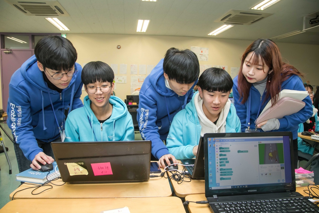 ▲ 지난 14일 인천광역시 연수구 연세대학교 국제캠퍼스에서 ‘2020 삼성 드림클래스 겨울캠프’에 참가한 중학생들이 대학생 멘토로부터 소프트웨어 교육을 받고 있다.