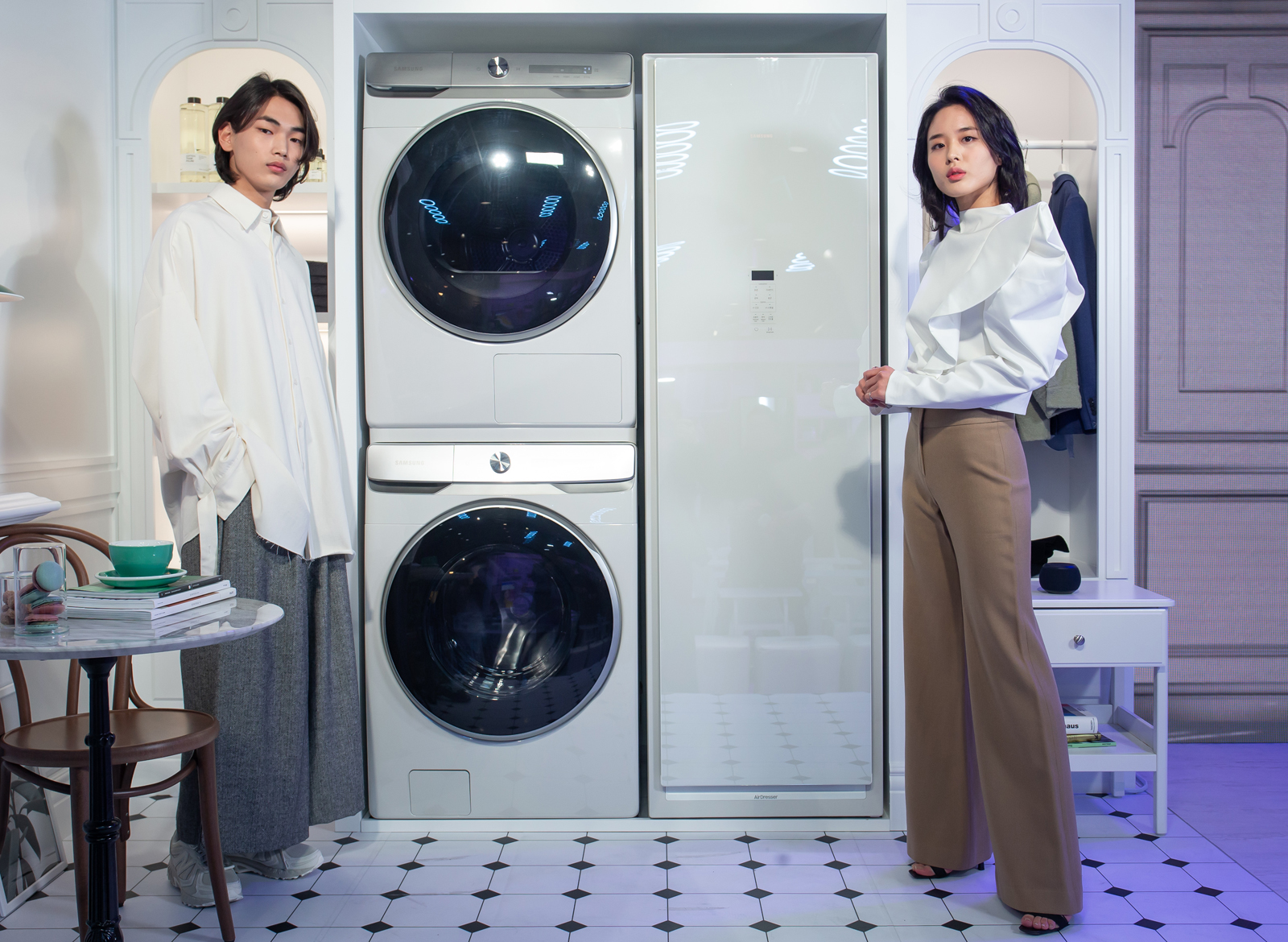 ▲ 삼성전자 모델이 삼성 디지털프라자 강남본점에 마련된 라이프스타일 쇼룸 ‘#프로젝트 프리즘(#ProjectPRISM)’에서 소비자 개개인의 사용 습관에 맞춰 세탁과 건조를 해주는 인공지능 세탁기·건조기 ‘삼성 그랑데 AI’를 소개하고 있다.