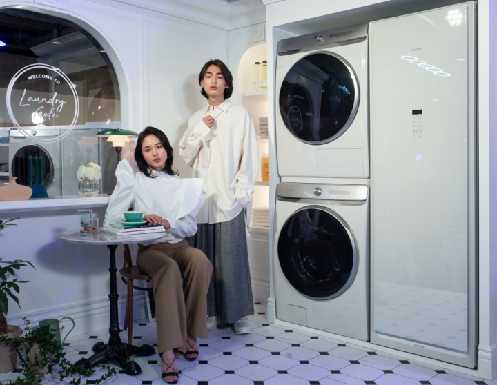 ▲ 삼성전자 모델이 삼성 디지털프라자 강남본점에 마련된 라이프스타일 쇼룸 ‘#프로젝트 프리즘(#ProjectPRISM)’에서 소비자 개개인의 사용 습관에 맞춰 세탁과 건조를 해주는 인공지능 세탁기·건조기 ‘삼성 그랑데 AI’를 소개하고 있다.